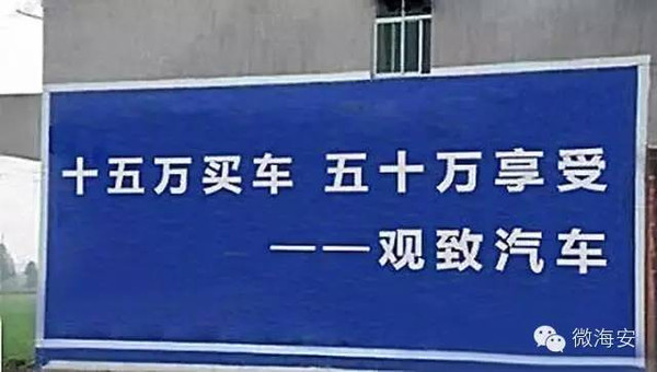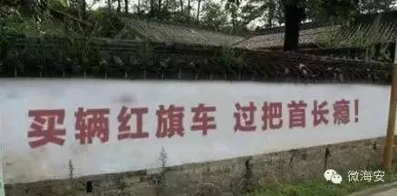 農(nóng)村發(fā)展步伐快,肥肉豈能不搶過(guò)來(lái)?看這些汽車廣告標(biāo)語(yǔ)果然是蠻拼的,刀槍棍棒舌劍叉,一路電線帶火花,不過(guò)作為月光一族的我們,還是期盼著拆二代一夜暴富之后再改頭換面換新車吧!